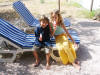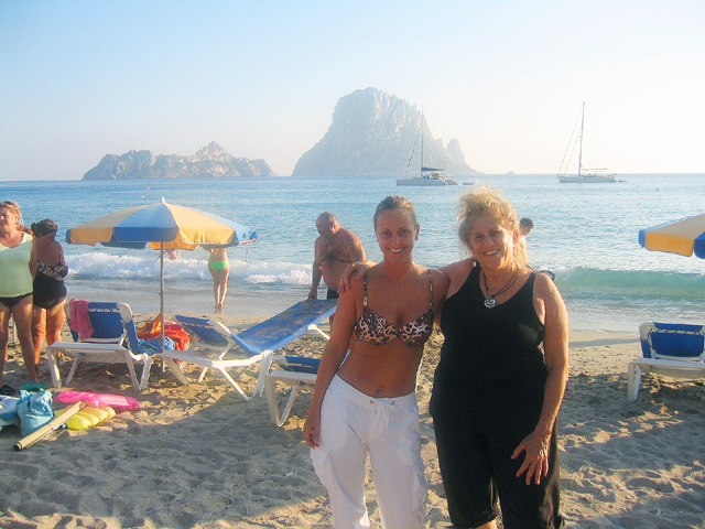 and Rochelle on the beach at Cala D'hort with Es Vedra in the background