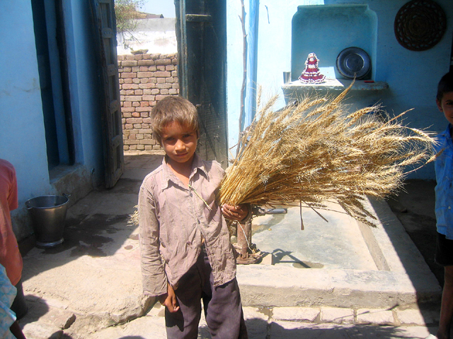 young man goes out to cut some wheat for us so we can see it in its pre-threshed
