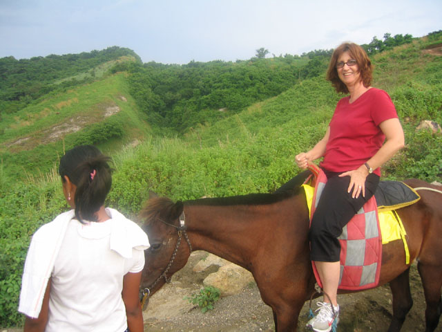 We took a day trip with Beth P. and Tang the driver up to Tagaytay to Taal Volcano, it was fascinating and beautiful. The volcano is an island in the middle of a lake and quite green and tropical. Fissures vent steam from random places in the greenery and rock. We rode ponies (Mike walked) to the lip of the volcano and the inner sides are also richly green and fertile with a huge lake in the center of the volcano. I would have loved a swim but we would have had to make a long approach via the lake by boat and then hiked to the lake and we didn't have the time. The day was cloudy which was good since we didn't have trouble with the heat and it made it very misty and mysterious.