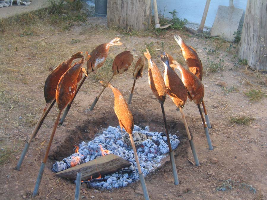 spices. They are put on a stake to roast around the fire for a few hours...the salt seals in the moisture, Mike says it's delicious