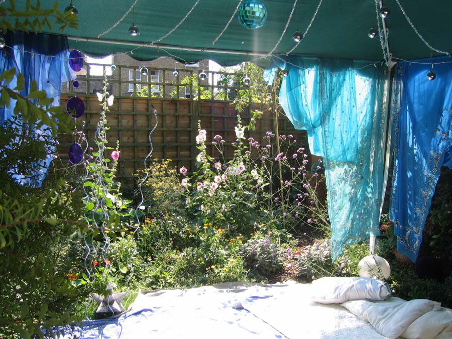 first, decorating, the living room is draped in pink and gold, the garden in blue and silver